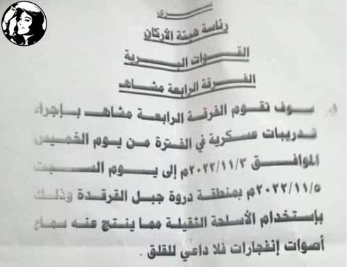 أصدر الجيش السوداني ،تنوية للمواطنين في العاصمة الخرطوم بأنه سيقوم بتنفيذ تدريبات بالذخيرة الحية يوم (3) إلى يوم (5) نوفمبر بمنطقة دروة جبل القرقدة مما ينتج عنه سماع دواي انفجارات ودعا التنوية المواطنين إلى عدم القلق.