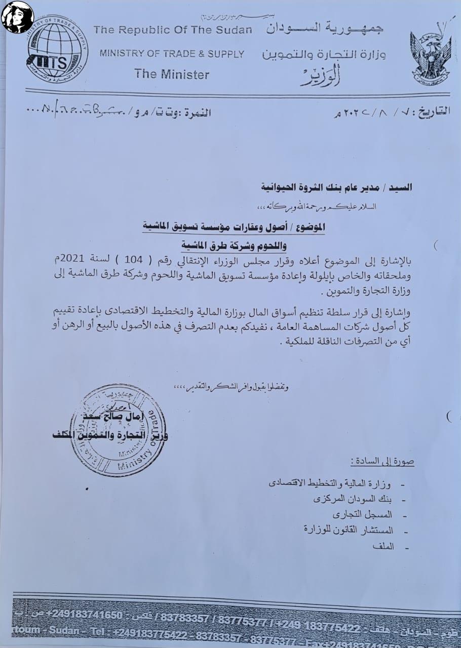 يذكر أن بنك الثروة الحيوانية بنك حكومي و قد سبق و أصدر مجلس الوزراء قراراً بالرقم (104) لسنة 2021 بإيلولة أصول و عقارات مؤسسة تسويق الماشية الى وزارة التجارة ،