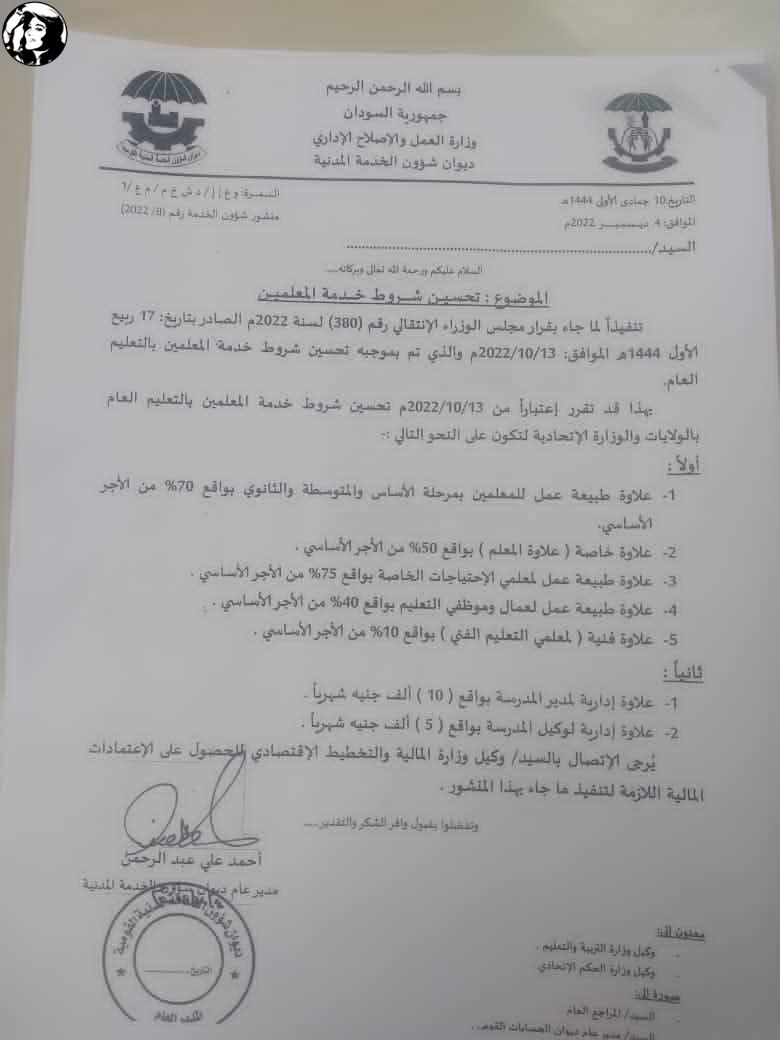 تشمل جميع معلمي السودان.. منشور تطبيق علاوتي طبيعة العمل وعلاوة المعلم