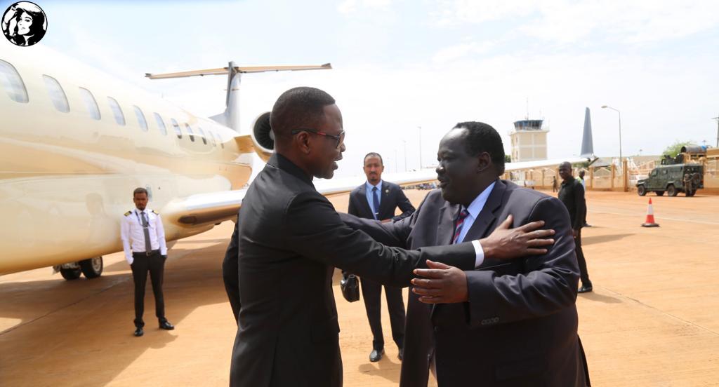 وكان في إستقباله بمطار جوبا الدولي مستشار رئيس جمهورية جنوب السودان للشؤون الأمنية الفريق توت قلواك وطاقم السفارة السودانية بجوبا.