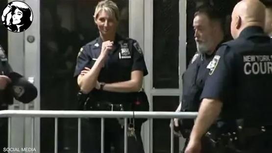 ظهرت الشرطية أمام الباب الذي دخل منه ترامب إلى قاعة المحكمة. ورصدتها الكاميرات وهي تبدو مبتسمة وعينيها على الكاميرات.