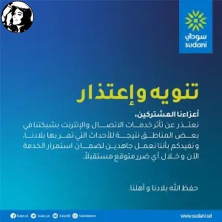 قالت شركة سوداني للاتصالات عبر صفتحتها في الفيس بوك انها تعتذر عن تأثر خدمات الاتصال و الإنترنت بشبكتنا في بعض المناطق نتيجة للأحداث التي تمر بها بلادنا ، ونفيدكم بأننا نعمل جاهدين لضمان استمرار الخدمة الآن و خلال أي ضرر متوقع مستقبلاً.