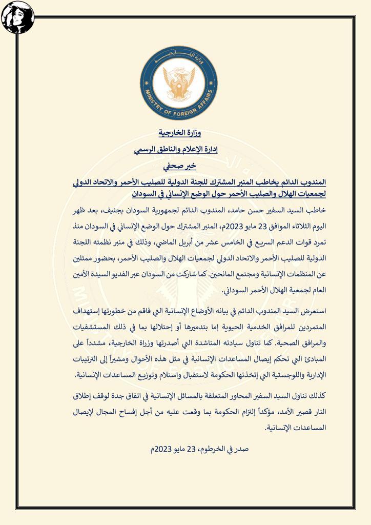 وخاطب السفير بعد ظهر اليوم الثلاثاء المنبر المشترك حول الوضع الإنساني في السودان منذ تمرد قوات الدعم السريع في الخامس عشر من أبريل الماضي، وذلك في منبر نظمته اللجنة الدولية للصليب الأحمر والاتحاد الدولي لجمعيات الهلال والصليب الأحمر، بحضور ممثلين عن المنظمات الإنسانية ومجتمع المانحين. كما شاركت من السودان عبر الفيديو الأمين العام لجمعية الهلال الأحمر السوداني.
