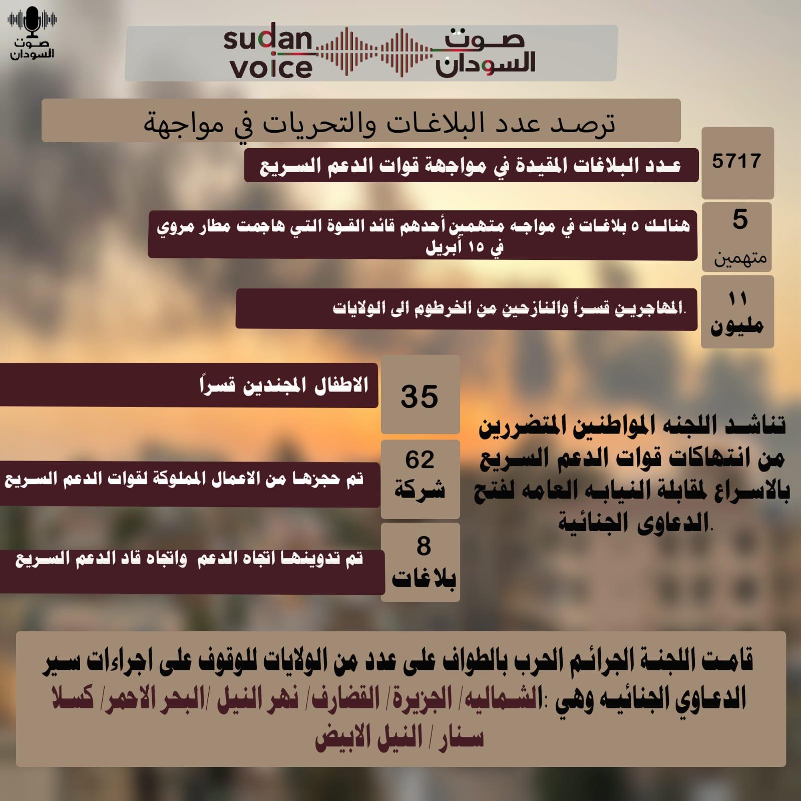 تناشد اللجنة المواطنين المتضرررين من انتهاكات قوات الدعم السريع المتمردة بالإسراع بمقابلة النيابة العامة لفتح الدعاوي الجنائية .