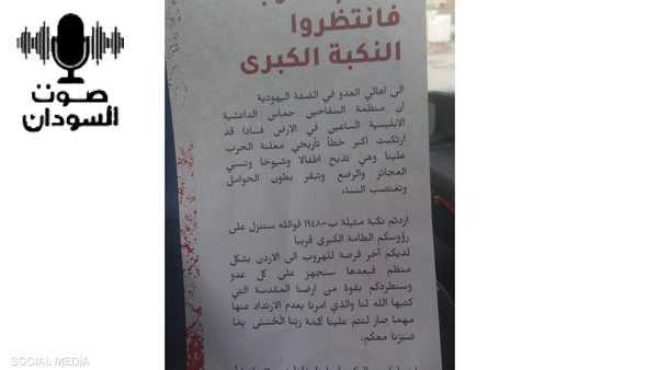 وهدد المنشور سكان الضفة الغربية، قائلا إن أمامهم فرصة “للهروب إلى الأردن (…) قبل أن نطردكم بالقوة”.