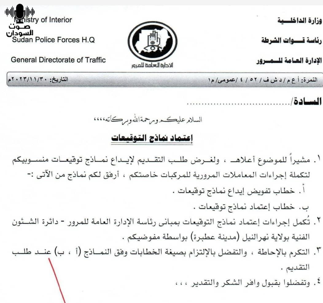 أصدرت الإدارة العامة للمرور، إعلانًا مهمًا، دعت فيه المؤسسات والشركات وأسماء العمل والبنوك وغيرها، إلى التقديم لاعتماد نماذج توقيعات منسوبيها لتكملة إجراءات المعاملات المرورية، برئاسة الإدارة العامة للمرور بولاية نهر النيل مدينة عطبرة، وذلك ابتداء من يوم الأحد العاشر من ديسمبر.