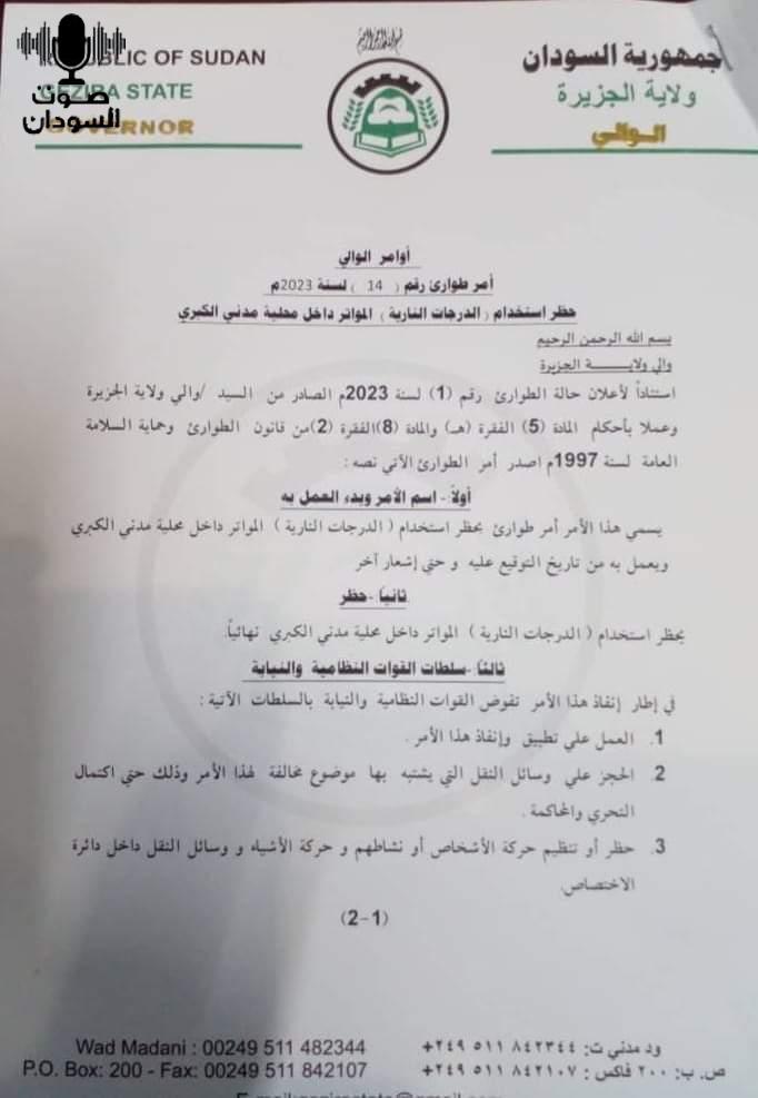 أصدر والي الجزيرة الطاهر إبراهيم الخير، قرارًا حظر بموجبه، استخدام الدراجات النارية “المواتر” داخل محلية مدني الكبرى.