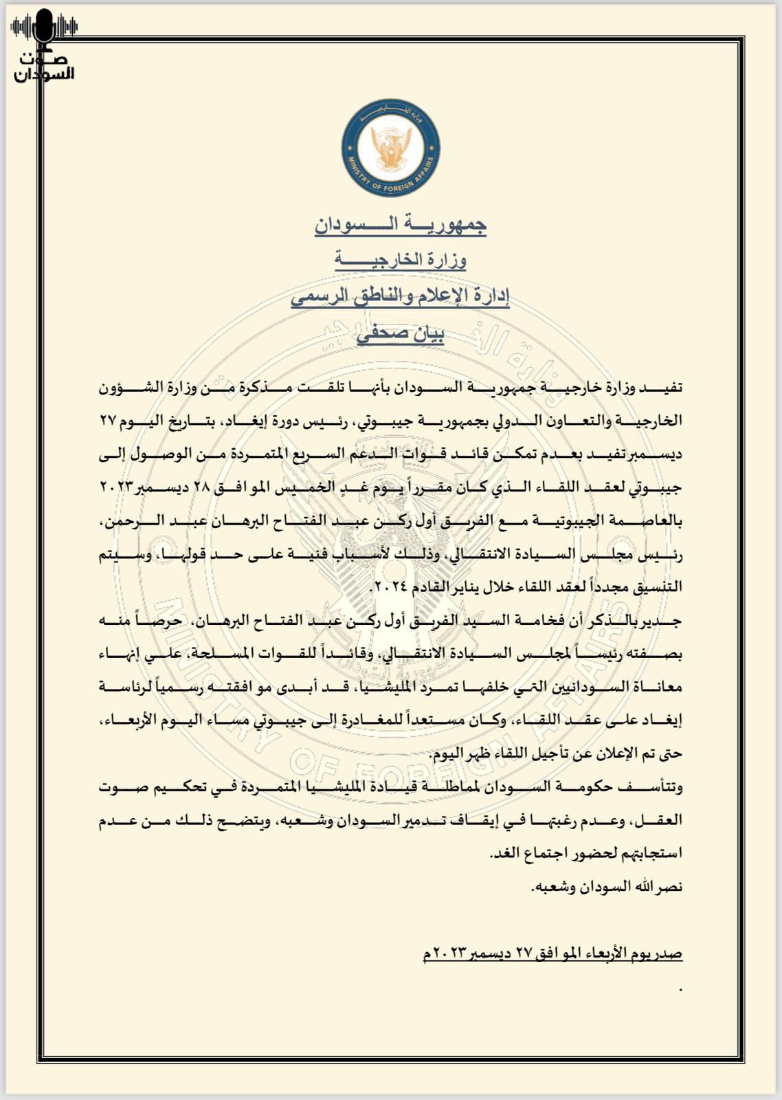 قالت وزارة الخارجية السودانية، إنها تلقت مذكرة من وزارة الشؤون الخارجية والتعاون الدولي بجمهورية جيبوتي، رئيس دورة إيغاد، بتاريخ اليوم ٢٧ ديسمبر تفيد بعدم تمكن قائد قوات الدعم السريع المتمردة من الوصول إلى جيبوتي لعقد اللقاء الذي كان مقرراً يوم غد الخميس الموافق ۲۸ ديسمبر ۲۰۲۳ بالعاصمة الجيبوتية مع الفريق أول ركن عبد الفتاح البرهان عبد الرحمن، رئيس مجلس السيادة الانتقالي، وذلك لأسباب فنية على حد قولها، وسيتم التنسيق مجدداً لعقد اللقاء خلال يناير القادم ٢٠٢٤
