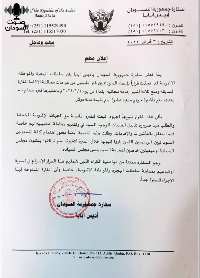 أعلنت سفارة جمهورية السودان اديس ابابا، أن سلطات الهجرة والمواطنة الإثيوبية قد اتخذت قراراً بإعفاء السودانيين غير المقيمين من غرامات مخالفة الإقامة للفترة السابقة ومنح ثلاثة أشهر إقامة مجانية ابتداء من يوم ٢٠٢٤/٢/٢م باعتبارها فترة سماح يتم بعدها منح تأشيرة خروج مدتها عشرة أيام بقيمة مائة دولار.