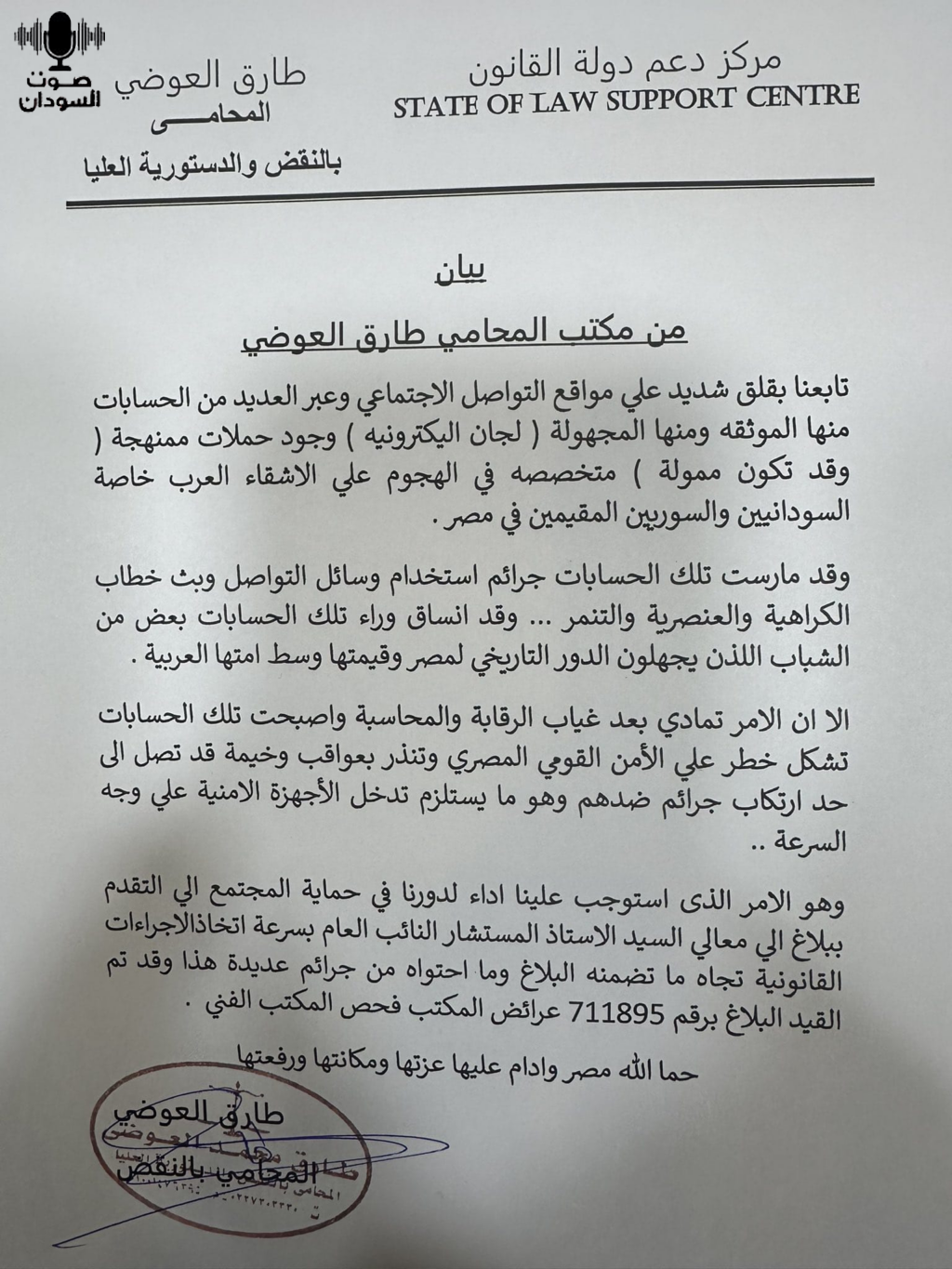 تقدم المحامي طارق العوضي، ببلاغ للنائب العام المصري، ضد لجان إلكترونية تخصصت في مهاجمة السوريين والسودانيين في مصر، واحال النائب العام البلاغ رقم (711895) المقدم إلى نيابة استئناف القاهرة للفحص.