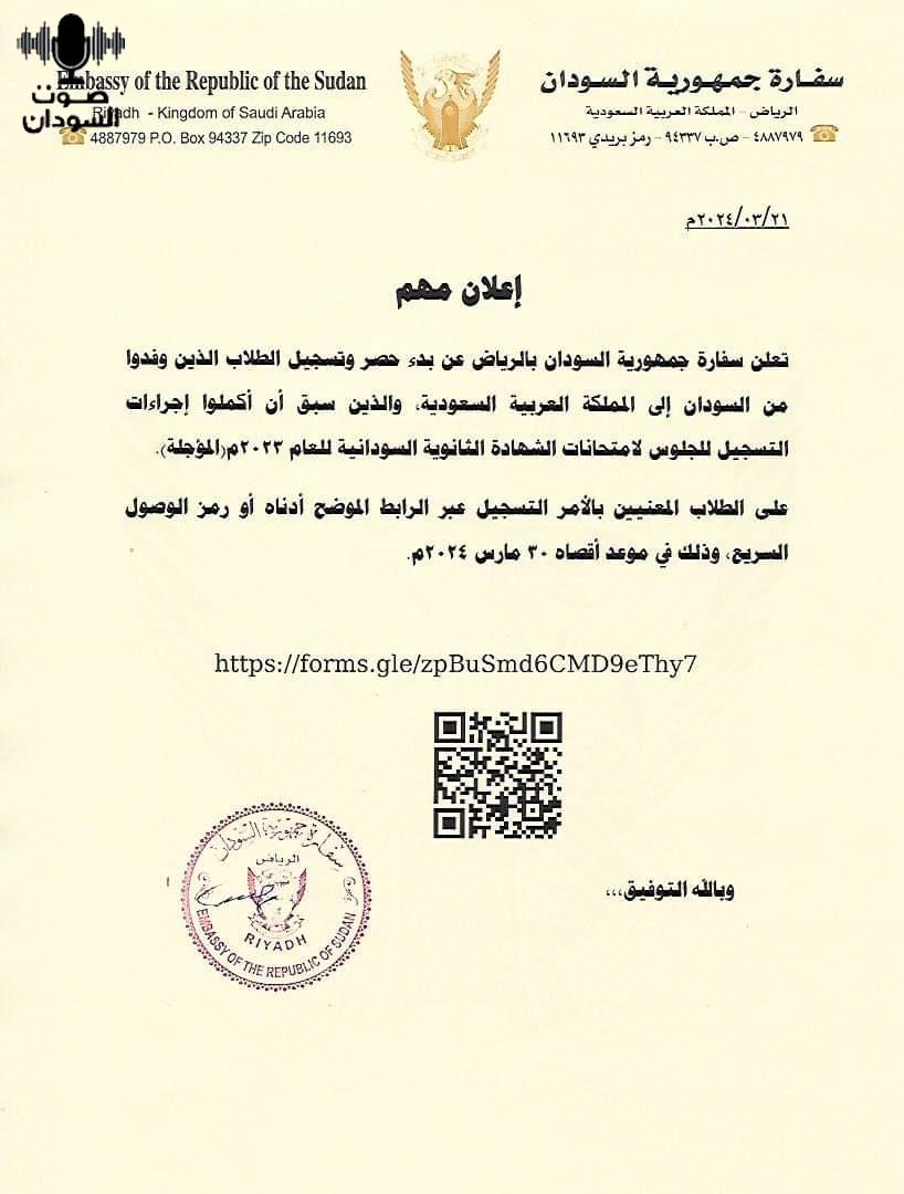 أعلنت سفارة جمهورية السودان بالرياض عن بدء حصر وتسجيل الطلاب الذين وفدوا من السودان إلى المملكة العربية السعودية، والذين سبق أن أكملوا إجراءات التسجيل للجلوس لامتحانات الشهادة الثانوية السودانية للعام ٢٠٢٣م (المؤجلة).