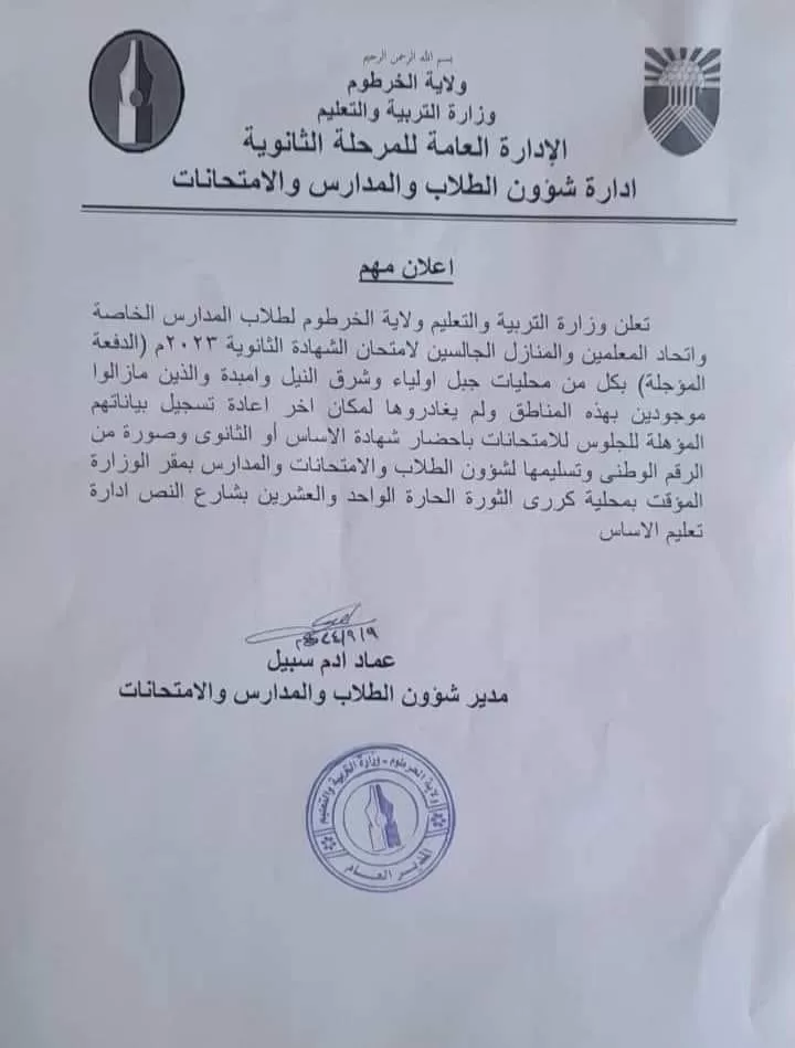 تنويه مهم من وزارة التعليم بالخرطوم لطلاب الشهادة السودانية الدفعة 2023 المؤجلة