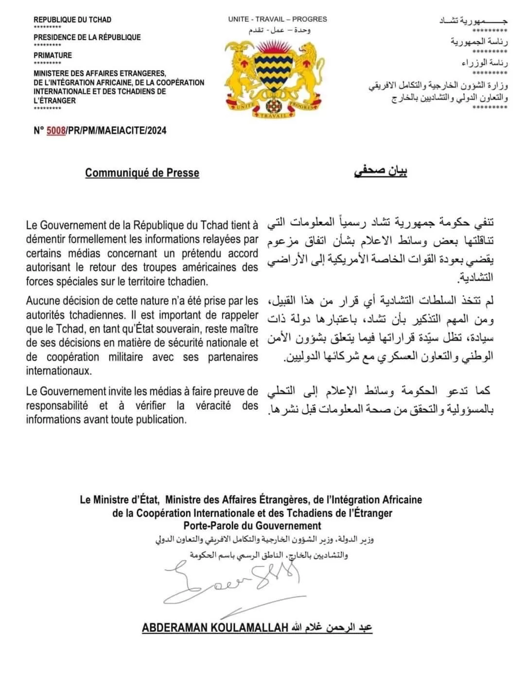 أكدت السلطات التشادية بألا صحة للمعلومات المتداولة في الوسائط بشأن ماتردد عن اتفاق بين واشنطون وانجمينا يقضي بعودة القوات الخاصة الأمريكية إلى الأراضي التشادية.
