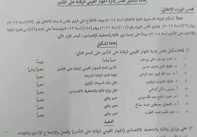 المحامي خالد وأكد الحقوقي المحامي عوض عبدالله، إن سكرتير مجلس إدارة الجهاز القومي للرقابة على التأمين للشركات زوّر قرار مجلس الوزراء (107/2024) بتاريخ 2024/9/25 والخاص بإعادة تشكيل مجلس إدارة الجهاز القومي للرقابة على التأمين بتاريخ 2024/11/7 وذلك بغرض إخطار الشركات بفحوى ومضمون ما جاء بقرار مجلس الوزراء الاتحادي بتعيين مجلس جديد للجهاز القومي للرقابة على التأمين وذلك بعد قبول استقالة رئيس المجلس وإقالة الأمين العام.