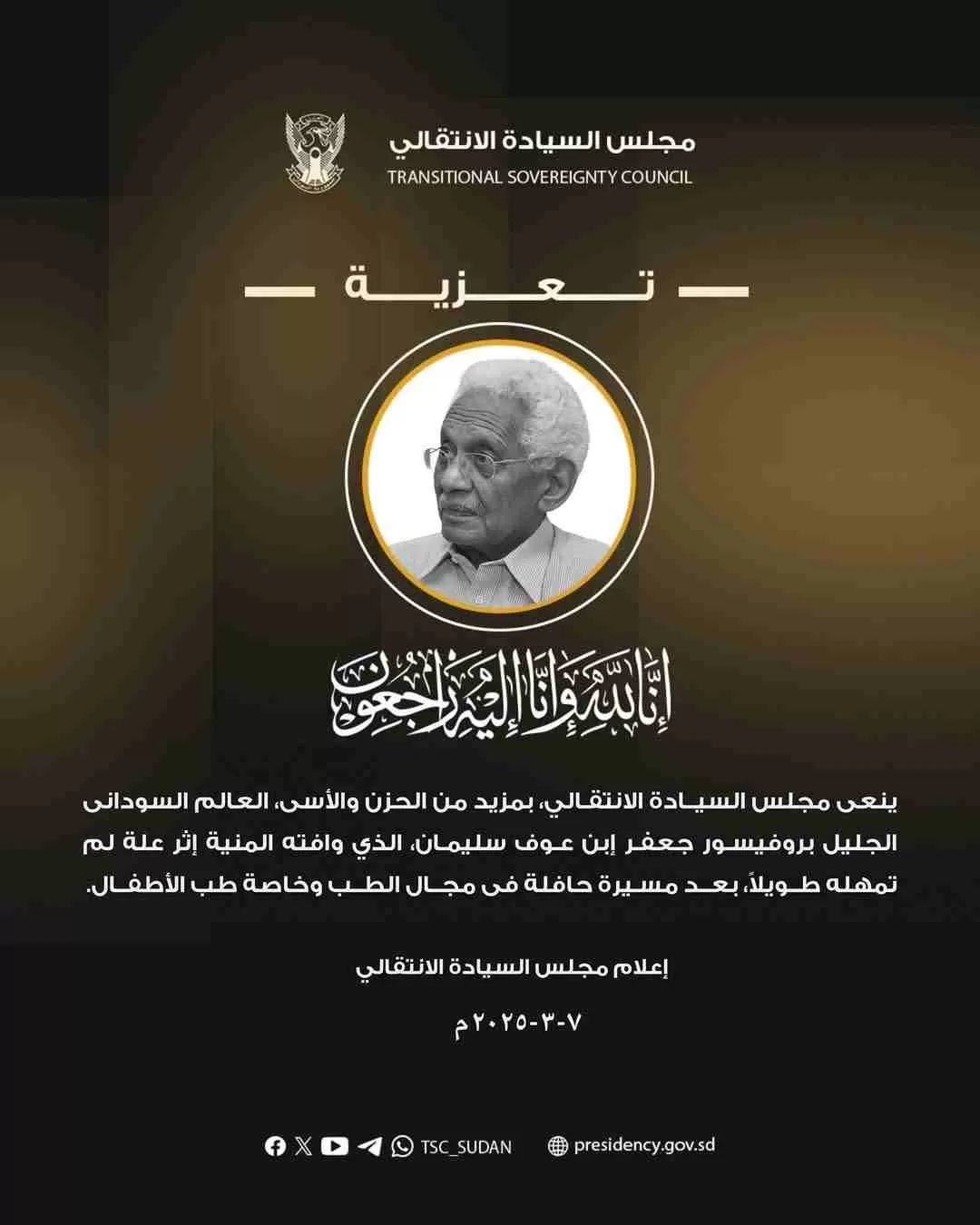 ينعى مجلس السيادة الانتقالي، بمزيد من الحزن والأسى، العالم السودانى الجليل بروفيسور *جعفر إبن عوف سليمان*، الذي وافته المنية إثر علة لم تمهله طويلاً، بعد مسيرة حافلة فى مجال الطب وخاصة طب الأطفال.