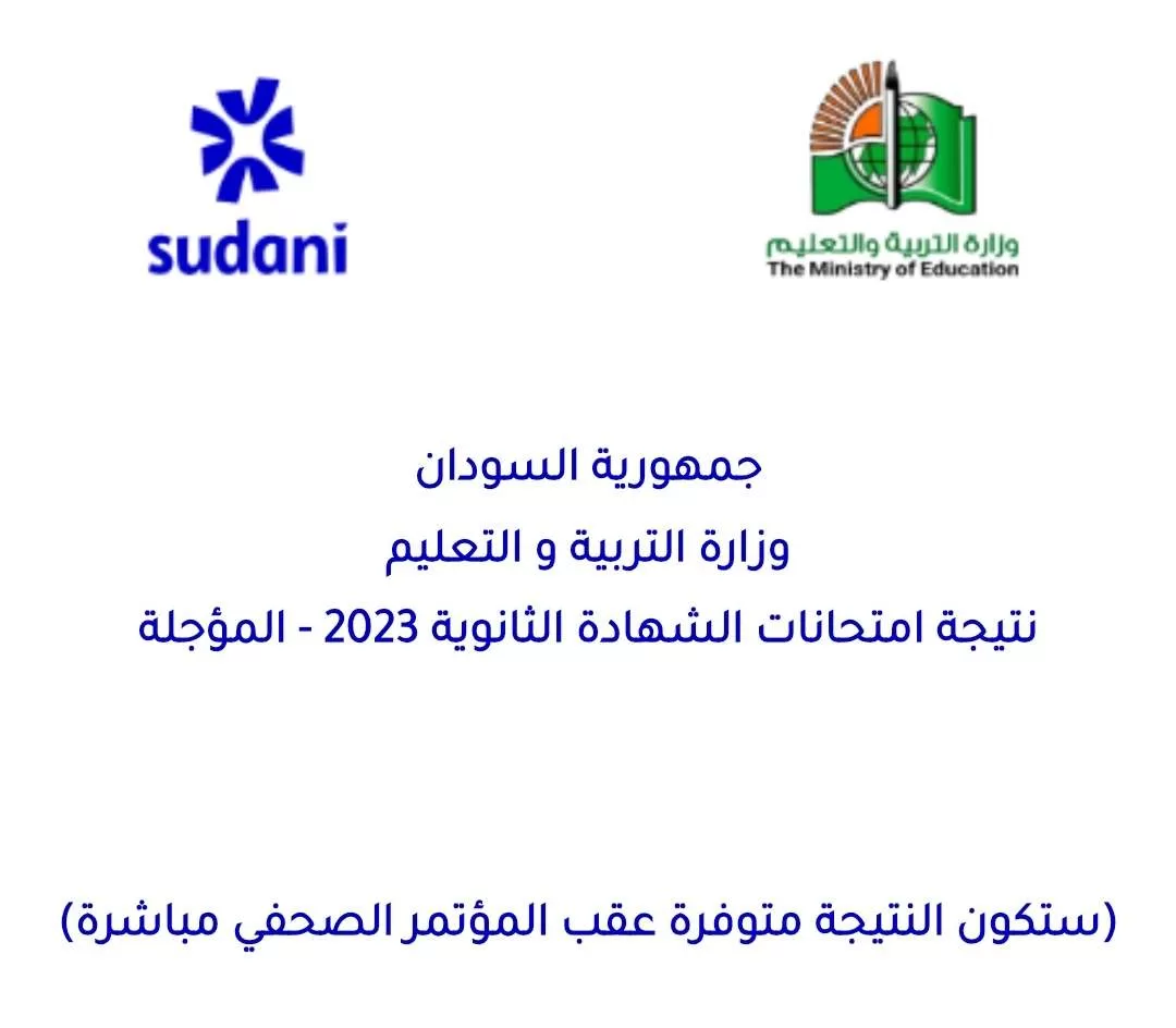 تُعلن وزارة التربية والتعليم السودانية، في تمام الساعة الثانية من ظهر اليوم الخميس، نتيجة امتحانات الشهادة السودانية للدورة المؤجلة للعام 2023م، وذلك عبر بث مباشر على شاشة تلفزيون السودان.
